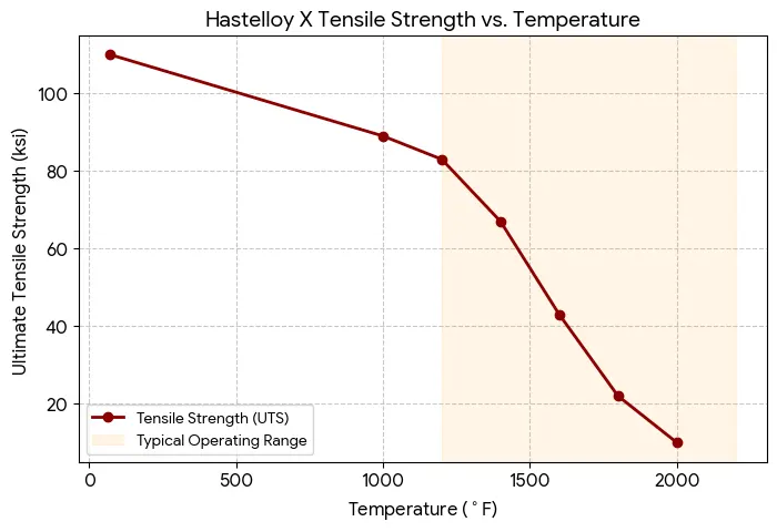 One of Hastelloy X’s defining features is its ability to retain significant mechanical integrity as temperatures rise.Below is a representation of how its tensile strength behaves at extreme temperatures: